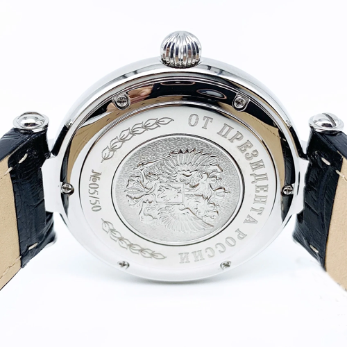 Ngoài ra, mặt kính còn có khả năng chống xước, chống lóa tốt khiến chúng ta có thể dễ dàng quan sát và sử dụng. Mặt số với rất nhiều chi tiết độc đáo và ấn tượng được kết hợp thật hài hòa và đẹp mắt. Những cọc số màu xanh được thiết kế theo hình dạng giọt nước cùng với 2 cọc số La mã đẹp mắt mang đến sự lạ lẫm trong thiết kế. Trên một nền trắng, thiết kế kim xanh và gắn ruby xanh cũng tạo nên sự nổi bật, đẹp mắt và hấp dẫn. Chữ kí tổng thống V.Putin và Quốc huy Nga nổi bật trên nền trắng thanh thoát.