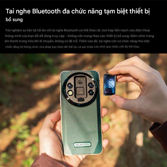 Điểm nhấn ấn tượng nhất của OUKITEL WP200 Pro chính là thiết kế mô-đun. Chiếc điện thoại này đi kèm với một tai nghe Bluetooth đa năng có thể tháo rời, được tích hợp một cách liền mạch. Bạn không cần mang theo tai nghe riêng biệt, vừa tiện lợi vừa tránh thất lạc. Tai nghe này không chỉ cho âm thanh tuyệt đỉnh mà còn có thể hoạt động như một chiếc smartwatch, theo dõi sức khỏe và các chế độ thể thao.